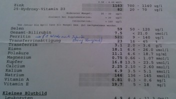 Vitamin D hab ich substituiert und meinen Wert innerhalb eines Monats von 56 auf 82 hochgebracht mit 50.000er. Jetzt nehm ich noch eine Erhaltungsdosis von 5000 tgl. bis zum Sommer, dann nur noch 1000er. Ganz weglassen kann ichs nicht, da ich Immunsuppresiva nehme und mich nicht so der Sonne aussetzen kann.