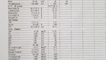Hallo, leider bin ich gestern in Krankenhaus eingeliefert worden mit starke Kopf -und Bauchschmerzen und blutige Durchfälle so dass ich den Termin bei NUK absagen musste. So habe ich neue Blutwerte bekommen .Ich habe sie angehängt.